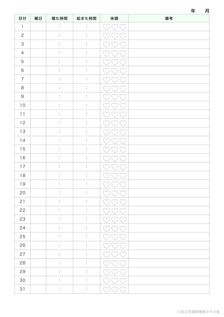 本シートは、起立性調節障害の症状管理を補助する目的で作成したものであり、医療行為や診断に代わるものではありません。体調に不安がある場合や症状が悪化している場合は、必ず医療機関へご相談ください。